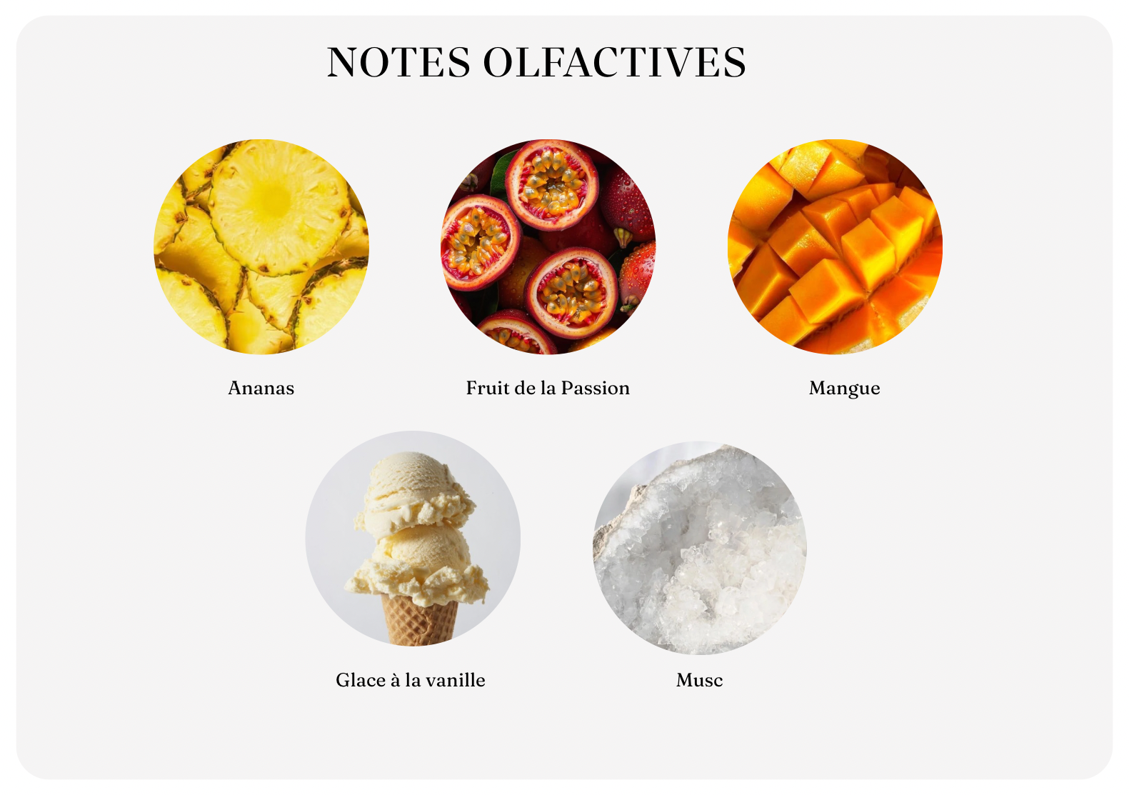 le fruit de la passion dévoile sa vivacité exotique, immédiatement enveloppé par la rondeur d’une mangue veloutée et la fraîcheur juteuse d’un ananas lumineux.